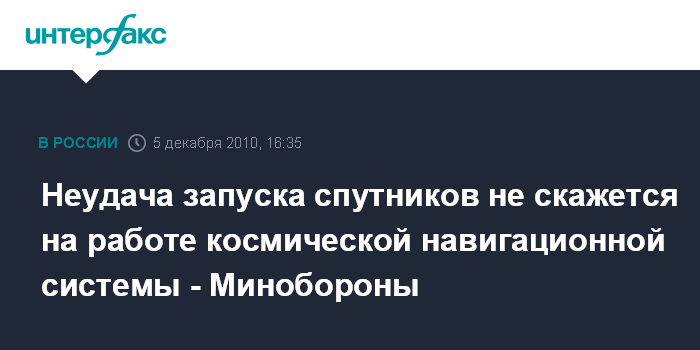Москва. 5 декабря. INTERFAX.RU - Неудача при запуске трех навигационных спутников "Глонасс-М" существенно не повлияет на работу российской космической навигационной системы, сообщили "Интерфаксу-АВН" в Минобороны. "Сегодня в составе орбитальной группировки ГЛОНАСС 26 спутников, в том числе есть даже два резервных. Эта группировка позволяет полностью покрывать навигационными сигналами территорию РФ", - сказал собеседник агентства. По его словам, дальнейшие планы восполнения группировки будут, скорее всего, скорректированы.