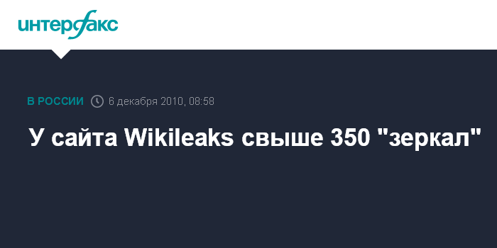 Москва. 6 декабря. INTERFAX.RU - Количество "зеркал" сайта Wikileaks все увеличивается - на понедельник 6 декабря их начитывается 355 штук.