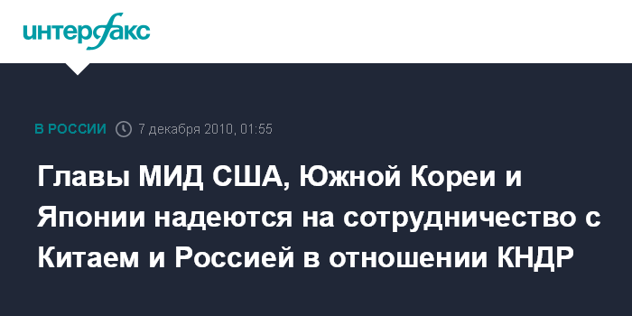 Вашингтон. 7 декабря. ИНТЕРФАКС - Серьезную обеспокоенность действиями КНДР выразили министры иностранных дел Японии, Южной Кореи и США в ходе трехсторонних переговоров, прошедших в понедельник в американской столице, говорится в специальном заявлении, распространенном госдепартаментом США по итогам переговоров.