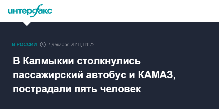 Ростов-на-Дону. 7 декабря. ИНТЕРФАКС-ЮГ - В ДТП с участием рейсового пассажирского автобуса и КАМАЗа в Калмыкии пострадали пять человек, сообщили агентству "Интерфакс-Юг" в ГУ МЧС РФ по республике.