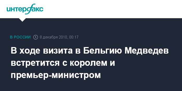 Москва. 8 декабря. ИНТЕРФАКС - Рабочий визит президента РФ Дмитрия Медведева в Бельгию начнется в среду, глава государства встретится с королем этой страны и проведет переговоры с премьер-министром.