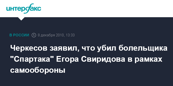 Москва. 8 декабря. INTERFAX.RU - Уроженец Кабардино-Балкарии Аслан Черкесов, обвиняемый в убийстве в Москве болельщика "Спартака" Егора Свиридова, заявил в суде, что это была самозащита.