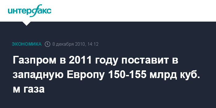 Брюссель. 8 декабря. INTERFAX.RU - "Газпром" в 20011 году поставит на экспорт в Западную Европу 150-155 млрд кубометров газа, сообщил журналистам заместитель председателя правления "Газпрома" Александр Медведев.