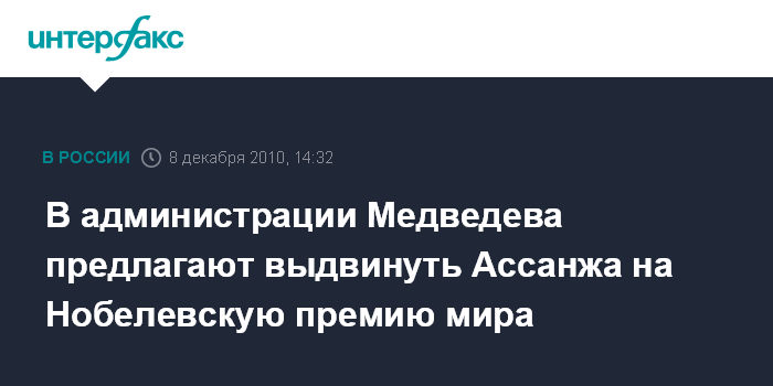 Брюссель. 8 декабря. INTERFAX.RU - Неправительственным организациям следует подумать над тем, чтобы выдвинуть Джулиана Ассанжа лауреатом Нобелевской премии, заявил источник в администрации президента РФ, комментируя ситуацию, сложившуюся вокруг основателя интернет-ресурса Викиликс.