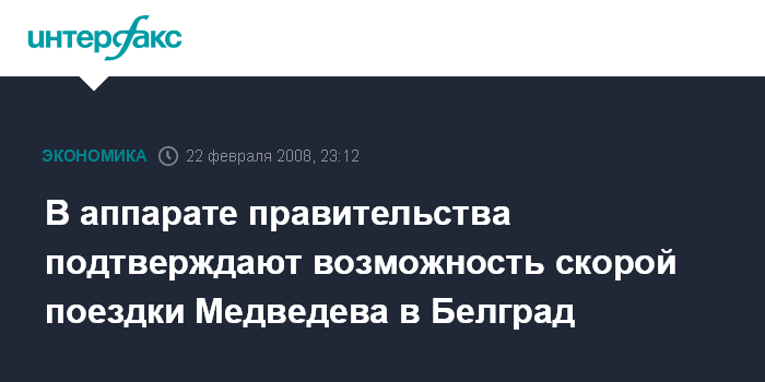 Москва. 22 февраля. INTERFAX.RU - В аппарате правительства РФ "Интерфаксу" подтвердили возможность поездки в ближайшие дни первого вице-премьера Дмитрия Медведева в Белград в связи с реализацией межправительственных соглашений о строительстве газопровода "Южный поток".