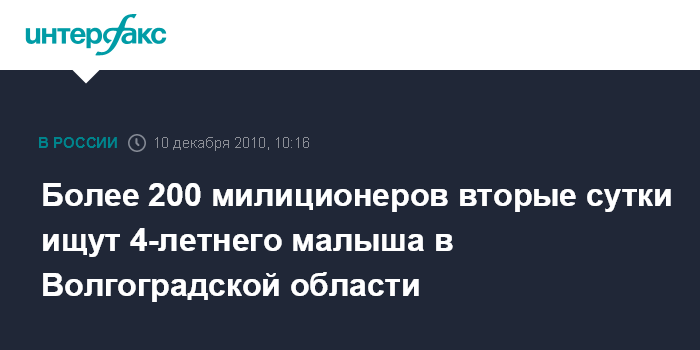 По его словам, для поисков пропавшего малыша сформирован сводный отряд из числа руководителей и сотрудников ГУВД по Волгоградской области. Милиционером помогают сотрудники МЧС, представители общественности и казачьи дружины.
