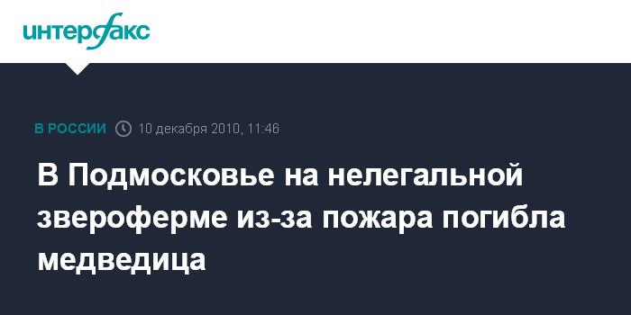Москва. 10 декабря. INTERFAX.RU - В результате сильного пожара, произошедшего на территории частного хозяйства в Московской области, погибла медведица, сообщил "Интерфаксу" источник в правоохранительных органах.