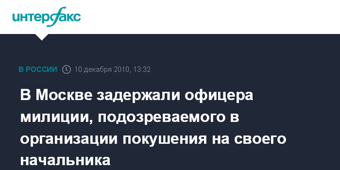Москва. 10 декабря. INTERFAX.RU - Сотрудник МВД России задержан по подозрению в организации покушения убийства своего непосредственного начальника, сообщил "Интерфаксу" источник в правоохранительных органах в пятницу.