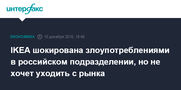 Москва. 10 декабря. INTERFAX.RU - Шведская IKEA выявила нарушения и злоупотребления в работе своих российских структур, намерена с ними бороться, и верит в потенциал российского рынка.