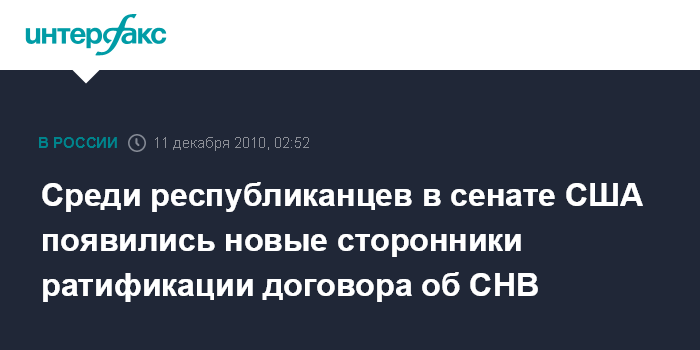Вашингтон. 11 декабря. ИНТЕРФАКС - Ряд представителей Республиканской партии в сенате США высказываются в поддержку ратификацию договора с Россией о стратегических наступательных вооружениях (СНВ).