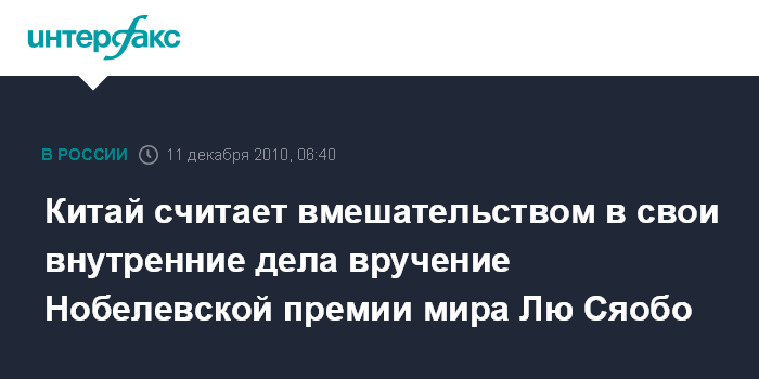 Пекин. 11 декабря. ИНТЕРЙФАКС-КИТАЙ - Китай выступает против вмешательства во внутренние дела под предлогом вручения Нобелевской премии мира китайскому диссиденту Лю Сяобо, заявила в субботу официальный представитель МИД КНР Цзян Юй.