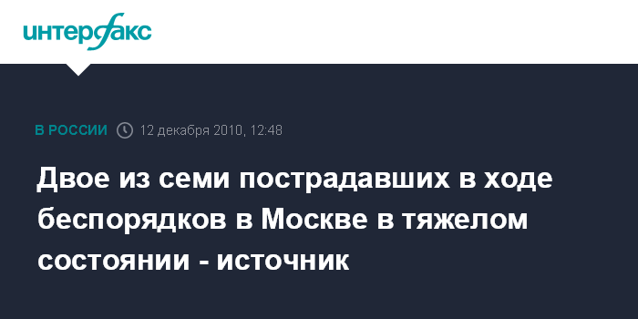 Москва. 12 декабря. INTERFAX.RU - По данным на 12:00 воскресенья, в городских больницах остаются семь пострадавших в результате столкновений на Манежной площади в субботу, сообщил "Интерфаксу" источник в медицинских кругах столицы. "Среди них двое - в тяжелом состоянии", - сказал собеседник агентства. Он уточнил, что один из этих пострадавших находится в Боткинской больнице, другой - в НИИ имени Склифосовского. Ранее источники сообщали о шести пострадавших, которые на утро воскресенья оставались в больницах, в том числе один в тяжелом состоянии.