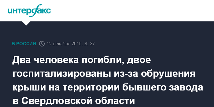 Екатеринбург. 12 декабря. ИНТЕРФАКС-УРАЛ - Два человека погибли в воскресенье в результате обрушения металлической крыши на территории бывшего деревообрабатывающего завода N9 в городе Тавде Свердловской области.