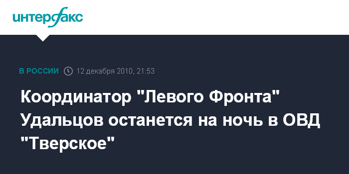 Москва. 12 декабря. ИНТЕРФАКС - Координатор оппозиционного движения "Левый Фронт" Сергей Удальцов проведет ночь в ОВД "Тверское", в понедельник утром его доставят в суд.