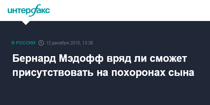 Как сообщалось, старший сын Б.Мэдоффа 46-летний Марк Мэдофф был найден мертвым в своей квартире. По предварительным результатам следствия, Мэдофф покончил жизнь самоубийством, пишет The Wall Street Journal.