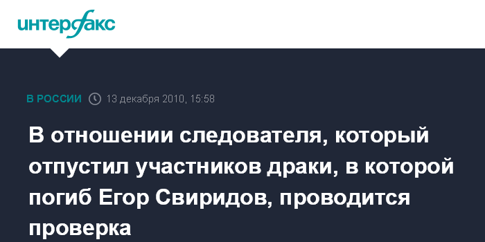В отношении следователя, который отпустил участников драки, в которой погиб Егор Свиридов, проводится проверка