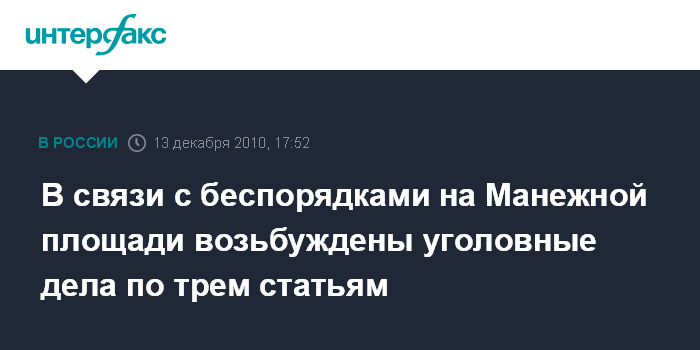 Москва. 13 декабря. INTERFAX.RU - По факту субботних беспорядков на Манежной площади возбужден ряд уголовных дел по статьям о хулиганстве, причинении легкого и среднего вреда здоровью, сообщила журналистам старший помощник прокурора Москвы Вероника Крапивенко.
