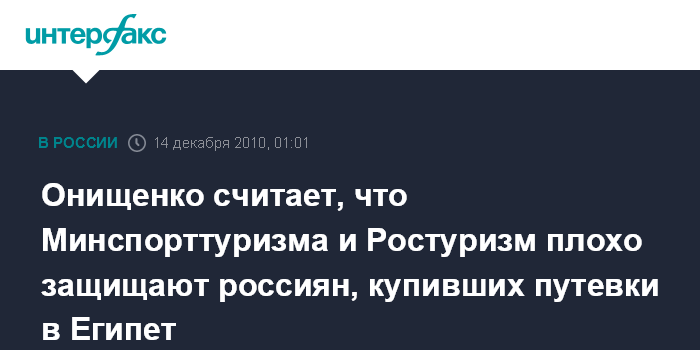 "Мы направили руководству Ростуризма свою официальную оценку. Мы указали Ростуризму на то, что он не в полной мере выполняет предоставленные ему полномочия. До настоящего времени отсутствует четко выраженная и формализованная в установленном порядке позиция Ростуризма по отношению к событиям в Египте", - сказал Г.Онищенко "Интерфаксу".
