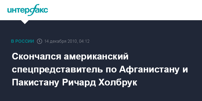 Вашингтон. 14 декабря. ИНТЕРФАКС - В США на 70-м году жизни скончался спецпредставитель госсекретаря США по Пакистану и Афганистану Ричард Холбрук, сообщает Си-эн-эн во вторник.