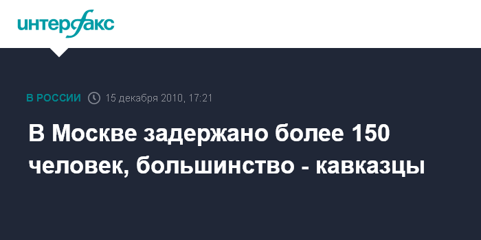Москва. 15 декабря. INTERFAX.RU - Более 150 человек задержаны в Москве за противоправные действия, большинство из них - выходцы из кавказских республик, заявил "Интерфаксу" официальный представитель ГУВД Москвы Виктор Бирюков.