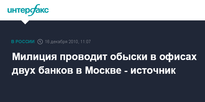 Москва. 16 декабря. INTERFAX.RU - Обыски проходят в офисах двух коммерческих банков в Москве, сообщил "Интерфаксу" источник в правоохранительных органах города.