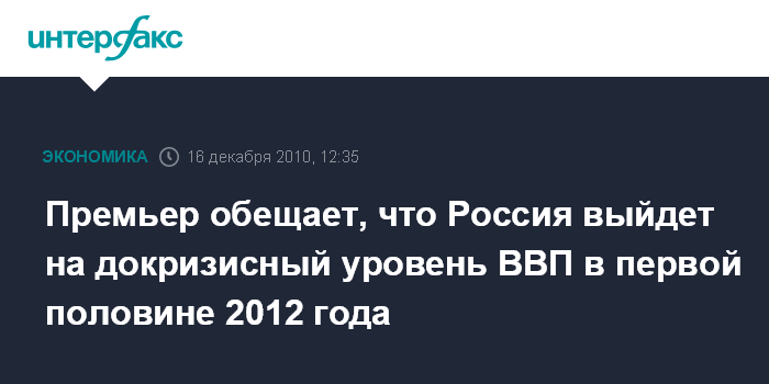 Москва. 16 декабря. INTERFAX.RU - Премьер-министр РФ Владимир Путин считает, что Россия в первой половине 2012 года выйдет на докризисный уровень экономики.