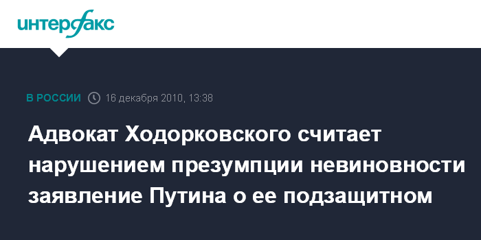 Адвокат Ходорковского считает нарушением презумпции невиновности заявление Путина о ее подзащитном