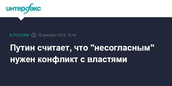 Москва. 16 декабря. INTERFAX.RU - Премьер-министр РФ Владимир Путин считает, что "несогласным" нужны не массовые мероприятия, а конфликт с властями.