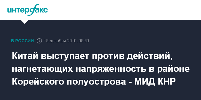 Пекин. 18 декабря. ИНТЕРФАКС-КИТАЙ - Китайская сторона решительно выступает против любых действий, которые могут привести к эскалации напряженности в районе Корейского полуострова, заявила в ночь на субботу официальный представитель МИД КНР Цзян Юй.