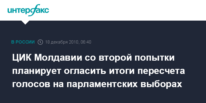 Кишинев. 18 декабря. ИНТЕРФАКС - Результаты пересчета голосов граждан Молдавии на досрочных парламентских выборах 28 ноября будут объявлены в субботу, 18 декабря, сообщил "Интерфаксу" секретарь Центральной избирательной комиссии республики Юрий Чокан.