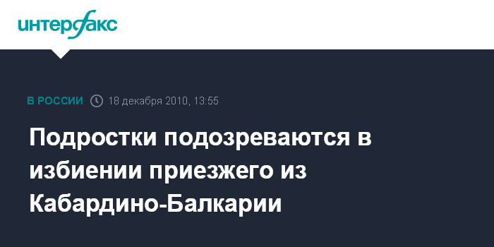 Москва. 18 декабря. INTERFAX.RU - В центре Москвы задержаны четверо молодых людей в возрасте от 14 до 19 лет, избившие приезжего из Кабардино-Балкарии, сообщил в субботу "Интерфаксу" источник в правоохранительных органах. По словам собеседника агентства, избивая мужчину подростки, выкрикивали националистические лозунги. "Все четверо задержаны и находятся в следственном изоляторе. Возбуждено уголовное дело по статье УК РФ "хулиганство, совершённое по мотивам межнациональной розни", - сказал источник.