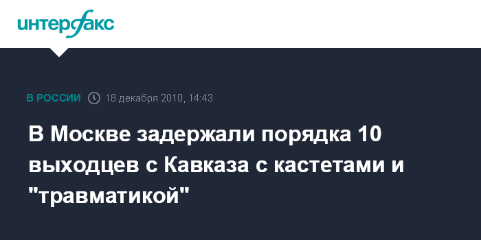 Москва. 18 декабря. INTERFAX.RU - Сотрудники милиции в Москве в понедельник задержали порядки десяти выходцев с Кавказа, у задержанных изымаются травматическое оружие и запрещенные предметы. По словам источника в правоохранительных органах, у них были изъяты газовые баллончики, травматические пистолеты, отвертки и кастеты.