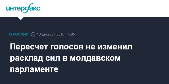 Кишинев. 18 декабря. INTERFAX.RU - Пересчет голосов на парламентских выборах в Молдавии не изменил расклад сил в будущем парламенте, заявил председатель Центральной избирательной комиссии Евгений Штирбу на заседании в субботу по подведению итогов пересчета голосов на выборах 28 ноября.