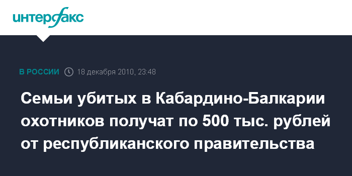 Нальчик. 18 декабря. ИНТЕРФАКС-ЮГ - Семьям убитых в Кабардино-Балкарии семерых охотников будет выплачено в качестве помощи от правительства КБР по 500 тыс. рублей, сообщили в субботу вечером агентству "Интерфакс - Юг" в пресс-службе главы республики.
