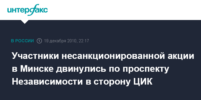 Минск. 19 декабря. ИНТЕРФАКС-ЗАПАД - Участники несанкционированной акции на Октябрьской площади вышли на проспект Независимости, перекрыв движение транспорта, передает корреспондент агентства "Интерфакс-Запад".