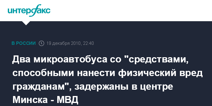 Минск. 19 декабря. ИНТЕРФАКС-ЗАПАД - Правоохранительными органами в районе Октябрьской площади обнаружена группа агрессивных молодых людей, у которых были отбиты два микроавтобуса со средствами, "способными нанести физический вред гражданам", сообщил журналистам в воскресенье в Минске первый заместитель министра внутренних дел Белоруссии Олег Пекарский.