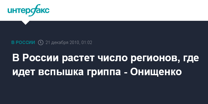 Глава Роспотребнадзора сказал, что еще в восьми субъектах РФ в настоящее время заболеваемость гриппом достигла уровня эпидпорога, но пока не превысила его. Это Санкт-Петербург, Карелия, Новгородская, Рязанская, Московская, Нижегородская, Кемеровская области и Хабаровский край.