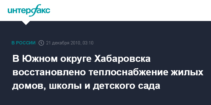 Хабаровск. 21 декабря. ИНТЕРФАКС-ДАЛЬНИЙ ВОСТОК - Бригада городских теплосетей завершила ремонтно-восстановительные работы по подаче тепла в шесть жилых домов, школу № 85 и детский сад № 80 в Южном округе Хабаровска.