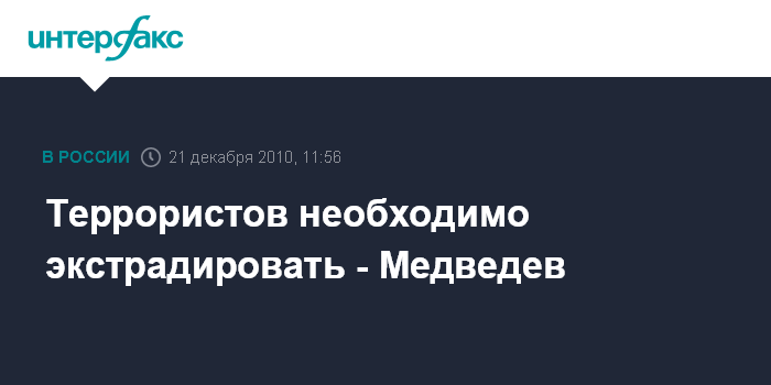 Дели. 21 декабря. INTERFAX.RU - Террористы должны подлежать безусловной выдаче, заявил президент РФ Дмитрий Медведев.
