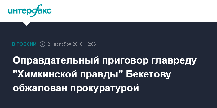 Москва. 21 декабря. INTERFAX.RU - Прокуратура обжаловала оправдательный приговор главному редактору газеты "Химкинская правда" Михаилу Бекетову по делу о клевете на главу администрации Химок Владимира Стрельченко.
