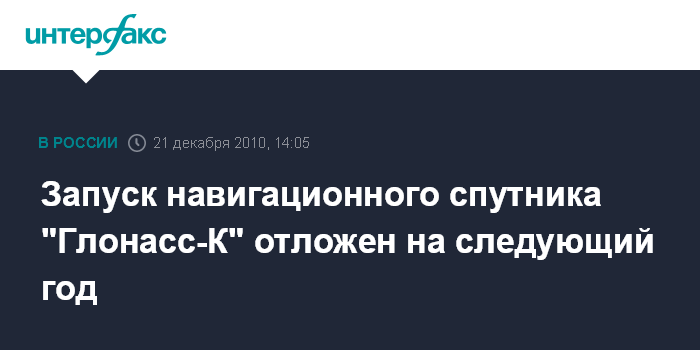 Москва. 21 декабря. INTERFAX.RU - Намеченный на 28 декабря запуск навигационного космического аппарата нового поколения "Глонасс-К" с космодрома Плесецк перенесен на 2011 год, сообщил "Интерфаксу-АВН" во вторник источник в ракетно-космической отрасли.