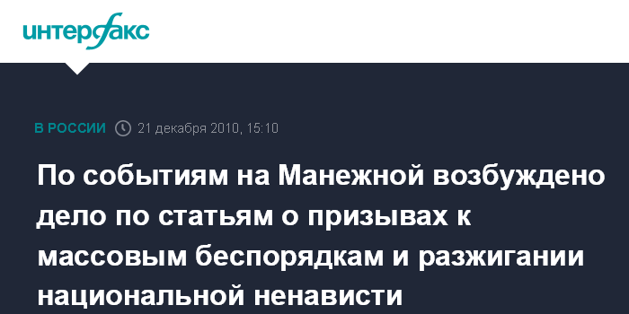 Москва. 21 декабря. INTERFAX.RU - В СК РФ подтвердили, что в связи с событиями на Манежной площади 11 декабря заведено уголовное дело по статьям о призывах к массовым беспорядкам, а также о разжигании национальной ненависти.