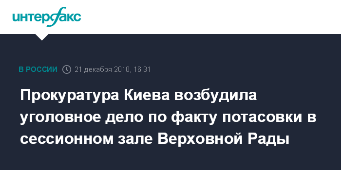 Киев. 21 декабря. INTERFAX.RU - Прокуратура Киева завершила проверку в связи с событиями, произошедшими 16 декабря в сессионном зале Верховной Рады Украины и возбудила уголовное дело по части 2 стати 344 Уголовного кодекса, сообщили агентству "Интерфакс" в пресс-службе Генеральной прокуратуры страны во вторник.