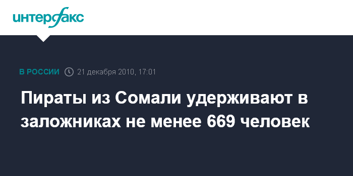 Найроби. 21 декабря. INTERFAX.RU - По меньшей мере 669 членов экипажей с 39 судов в настоящее время остаются в заложниках у сомалийских пиратов, говорится в коммюнике организации "Экотерра интернэшнл", которая занимается гуманитарной помощью и вопросами борьбы с пиратами у побережья Сомали.
