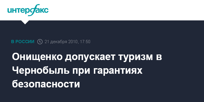 Москва. 21 декабря. INTERFAX.RU - Роспотребнадзор потребует гарантий безопасности для российских туристов, если Украина примет решение открыть Чернобыльскую зону для посещения, заявил "Интерфаксу" во вторник глава ведомства, главный государственный санитарный врач РФ Геннадий Онищенко.