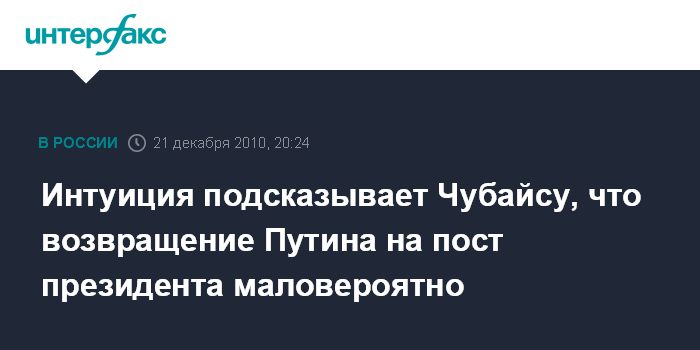На вопрос, можно ли ожидать возвращения Путина в президентское кресло в 2012 г., Чубайс ответил: "Можно, но этот сценарий кажется мне менее вероятным".