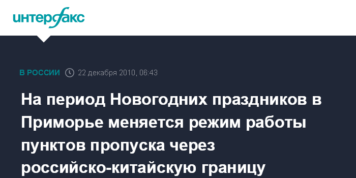 Владивосток. 22 декабря. ИНТЕРФАКС - ДАЛЬНИЙ ВОСТОК - На период Новогодних праздников решениями координационных советов пунктов пропуска на российско-китайской границе в Приморье изменен режим работы погранпереходов.