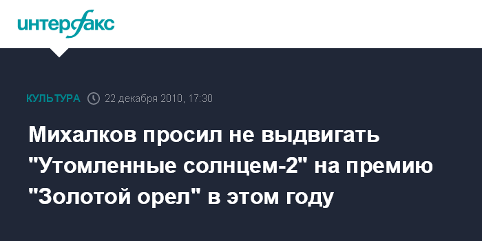 Михалков просил не выдвигать "Утомленные солнцем-2" на премию "Золотой орел" в этом году