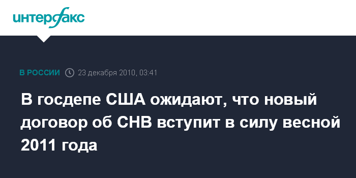 Вашингтон. 23 декабря. ИНТЕРФАКС - В Вашингтоне надеются, что российско-американский договор о дальнейшем сокращении и ограничении стратегических наступательных вооружений вступит в силу весной следующего года.