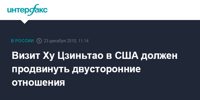 Пекин. 23 декабря. INTERFAX.RU - Китайская сторона надеется, что предстоящий визит председателя КНР Ху Цзиньтао в США послужит дальнейшему развитию отношений между двумя странами, сказала в четверг на брифинге официальный представитель МИД КНР Цзян Юй.